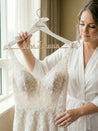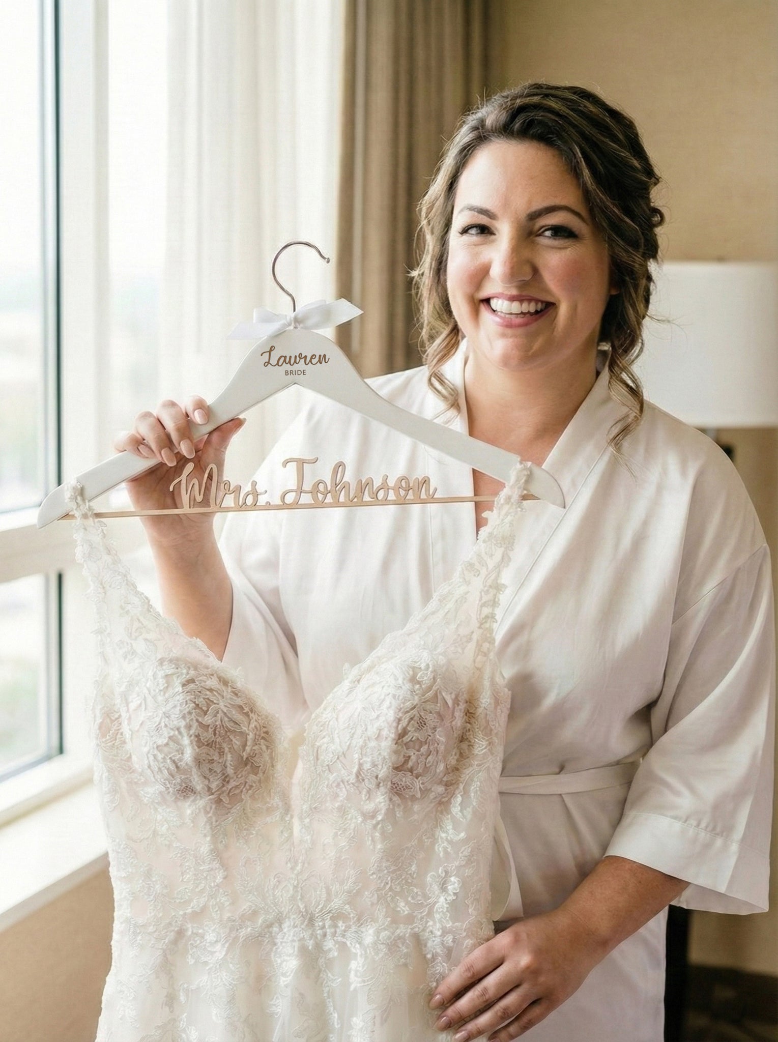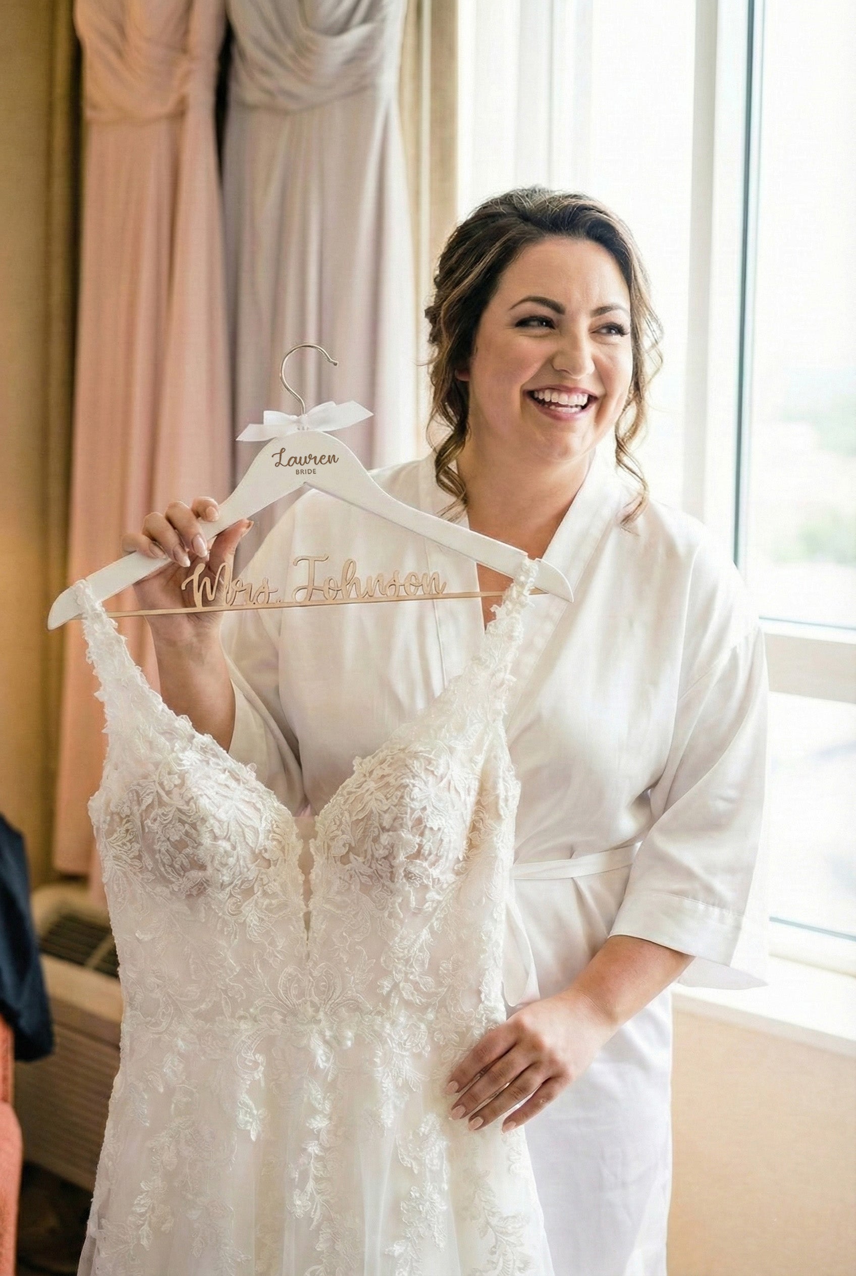 Elevate your wedding experience with our exquisite personalized bride hangers. Crafted with the utmost care, these hangers feature a laser-cut wooden inscription of the future last name of the bride along the bottom, creating a stunning and unique keepsake for your special day.